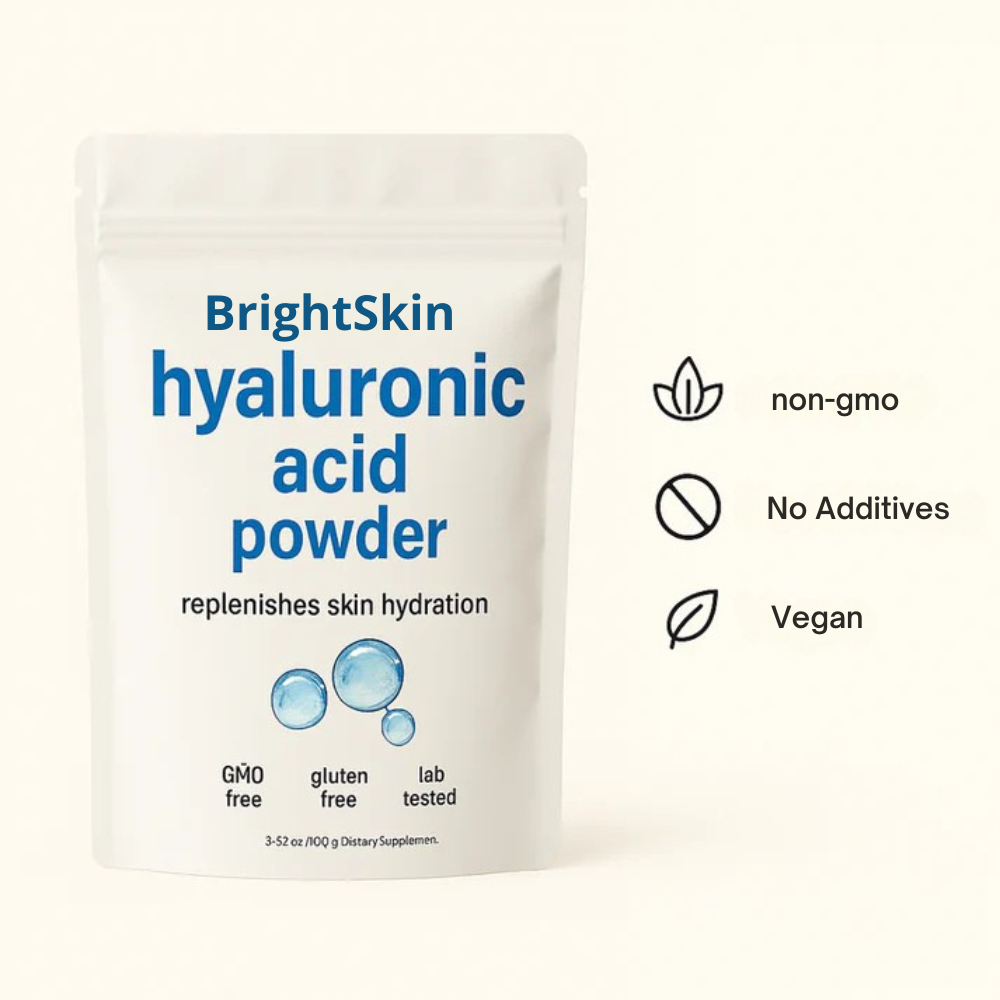 BrightSkin Hyaluronic Acid Powder er designet til nem absorption og hurtige resultater og hjælper din hud med at forblive smidig, frisk og ungdommelig hele dagen.