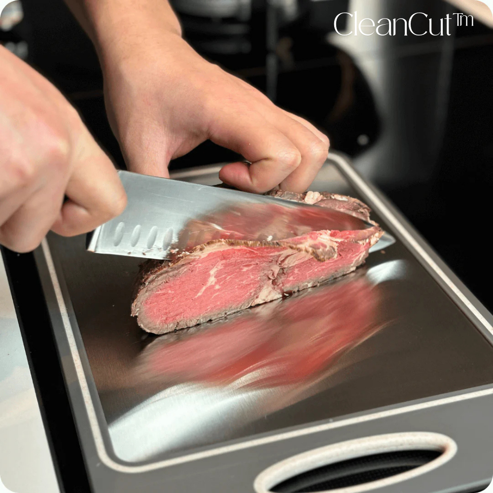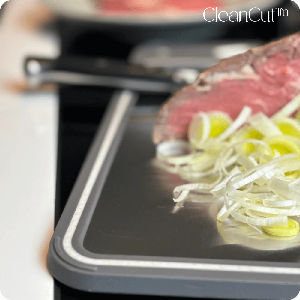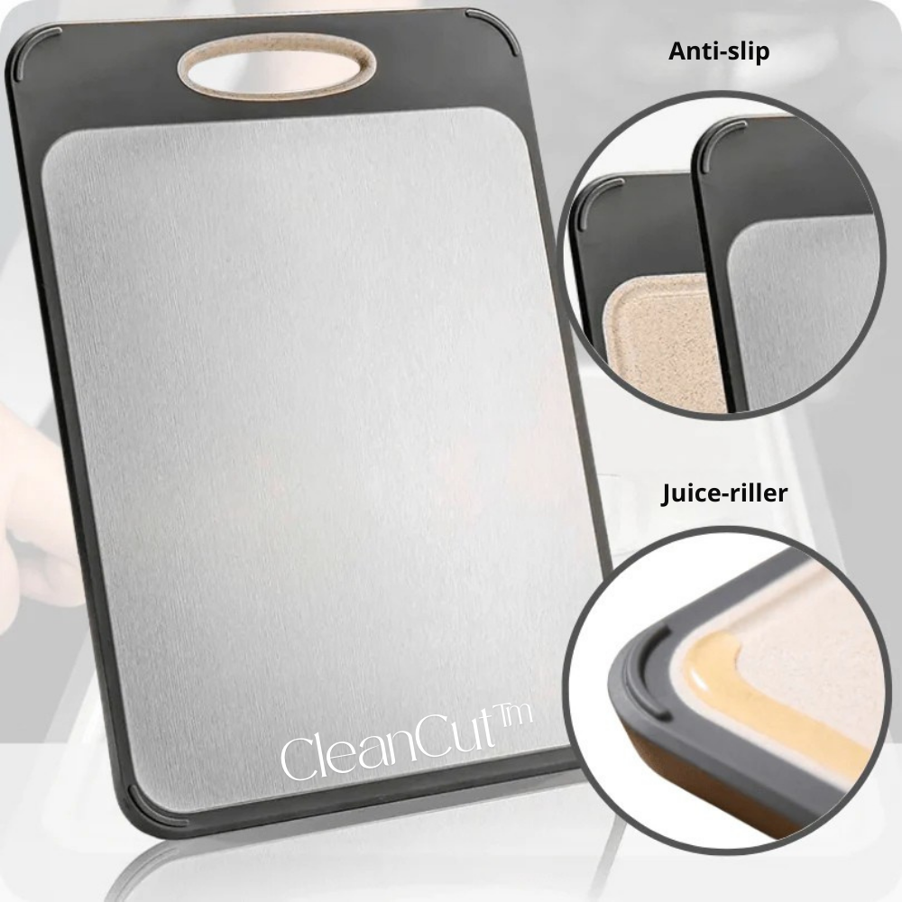 CleanCut™ kombinerer smarte materialer med et dobbeltsidet design. Overfladen i rustfrit stål er ideel til kød og fisk takket være dens antibakterielle egenskaber. Materialet af hvedestrå giver en miljøvenlig, hygiejnisk skæreflade til frugt og grønt.