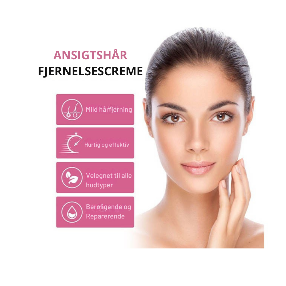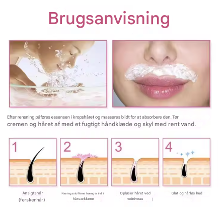 Brug den på overlæben, hagen eller kinderne. På blot 3–5 minutter fjernes håret, og huden efterlades blød, beroliget og fugtet – helt uden voks eller barbering.