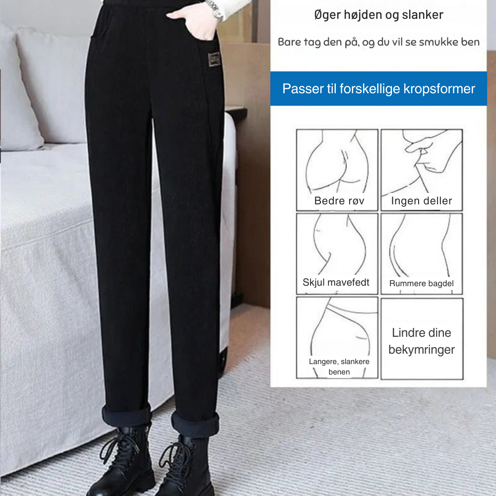Lad ikke det kolde vejr påvirke dit valg af garderobe. FleeceLuxe™-bukser kombinerer elegance og funktionalitet, hvilket gør dem perfekte til både arbejde, afslappede udflugter og særlige begivenheder. Med deres høje talje og moderne pencil leg-snit smigrer de alle benformer - uanset om du har bøjede ben, knæ eller andre benformer.