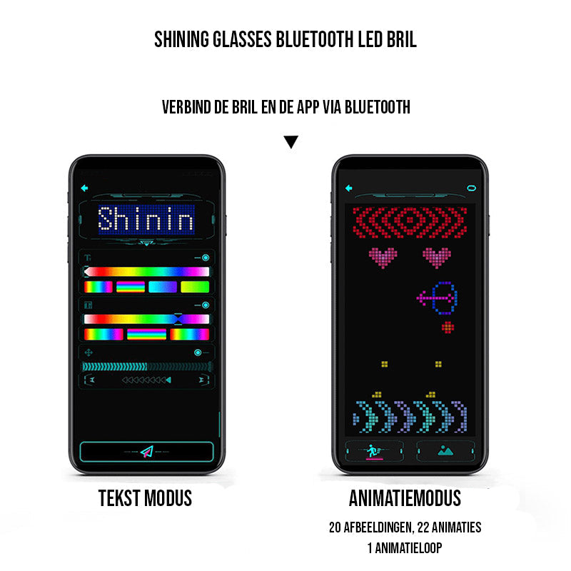 Med disse højteknologiske Bluetooth LED-briller fra LEDsLook™ kan du programmere din egen tekst, dit eget billede eller din egen animation! Unikke briller, der skiller sig ud ved enhver begivenhed. Tilpas din tekst, dit billede eller din animation med den medfølgende app »Shining Glasses« (IOS & Android), eller brug en af de 22 forudindstillede animationer eller 20 forudindstillede billeder.