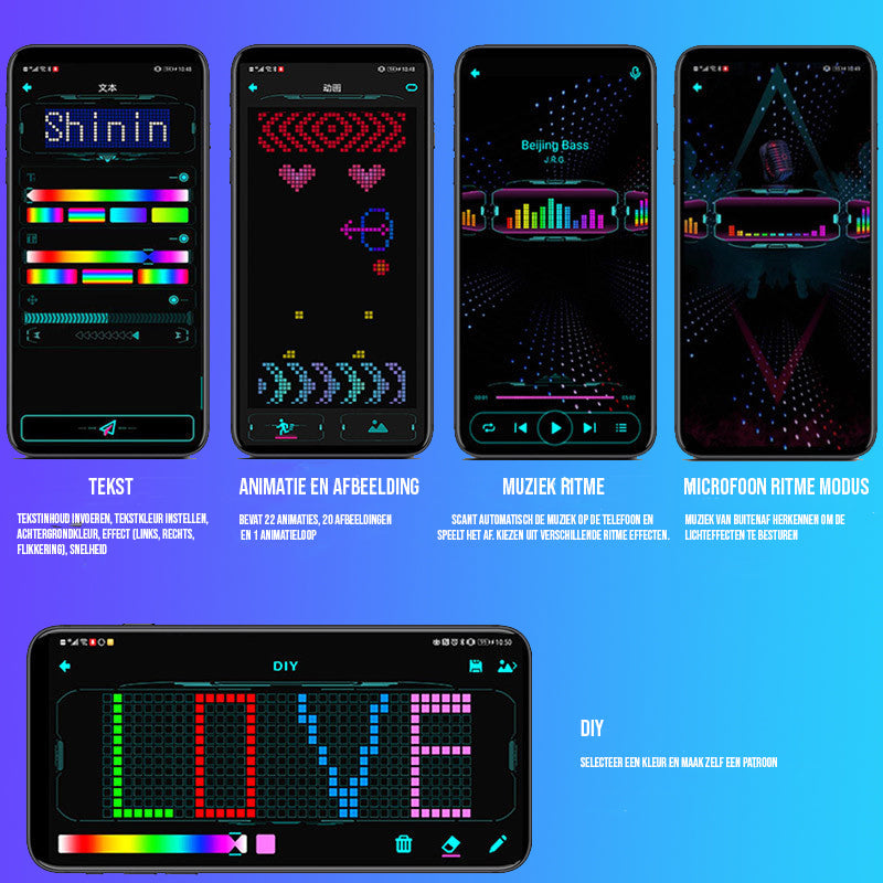 Du kan også indstille en equalizer, der reagerer på musikken på din telefon eller musikken fra dine omgivelser, eller du kan bruge DIY-tilstanden til at designe noget helt selv! Skift nemt mellem de forskellige animationer med knappen på brillerne. Mulighederne er uendelige! Der er en tænd/sluk-knap på masken. Ved at holde knappen nede kan du tænde og slukke for brillerne, og ved at trykke kort på knappen kan du skifte mellem de forskellige animationer. For at vise dine hjemmelavede designs på brillerne skal du tænde for appen og oprette forbindelse til Bluetooth, så du kan parre dine briller.