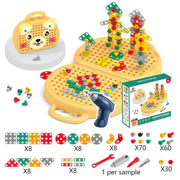 Med den børnesikre, elektriske skruetrækker og farverige dele kan børn bygge biler, dyr, robotter og alt, hvad fantasien rækker til. Det styrker hånd-øje koordination, kreativitet og koncentration, mens de leger. Hver konstruktion giver en følelse af stolthed og succes.