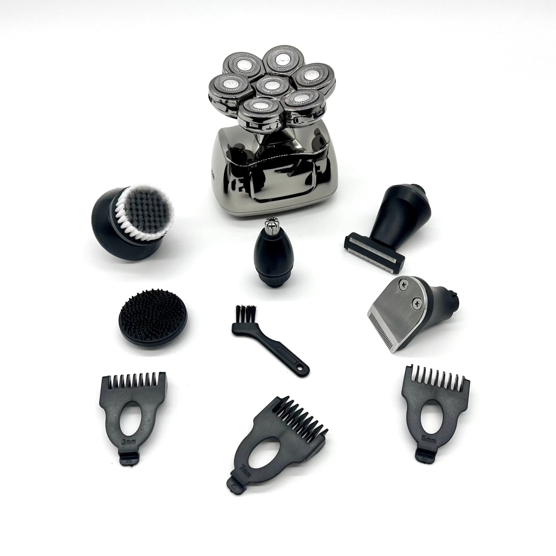 Med seks forskellige aftagelige tilbehørsdele - herunder en skægtrimmer, hårtrimmer, barbermaskine, næsehårstrimmer, ansigtsrensebørste og ansigtsmassagebørste - tilbyder denne enhed en omfattende løsning til alle dine skønhedsbehov.