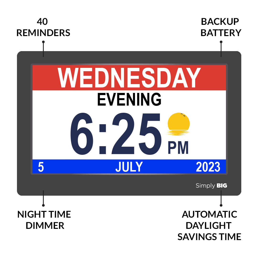 ReminderClock™ er her for at skabe ro og struktur – med tydelig skærm, store tal og op til 40 daglige påmindelser, skræddersyet til behovet. Den fungerer intuitivt, selv for dem med hukommelsesudfordringer, demens eller nedsat syn.