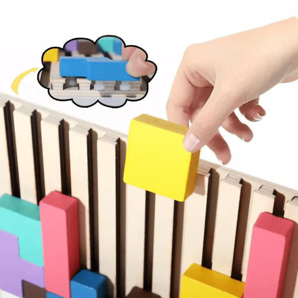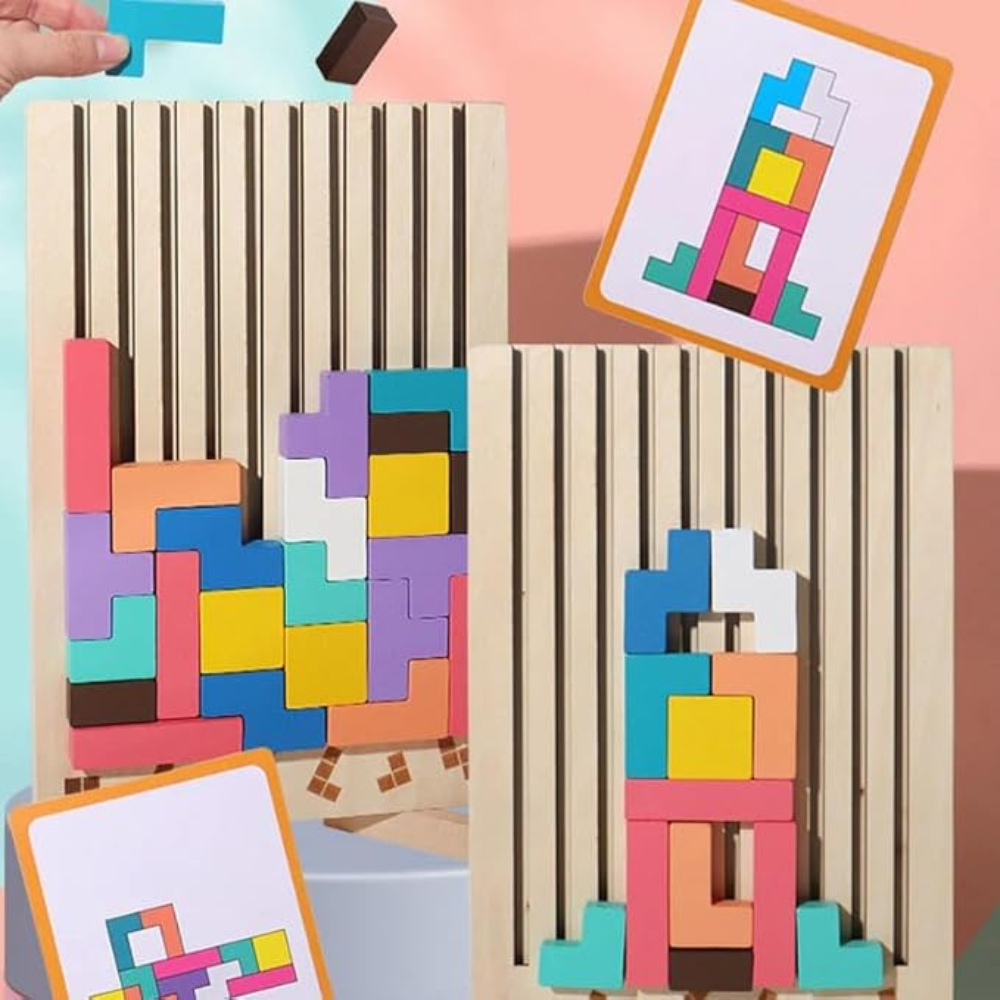 TetrisPuzzle består af farverige træbrikker, der skal samles i forskellige mønstre. Det ser simpelt ud – men er overraskende vanedannende. Spillet træner logik, koncentration og kreativitet, og det er lige så sjovt for voksne som for børn.