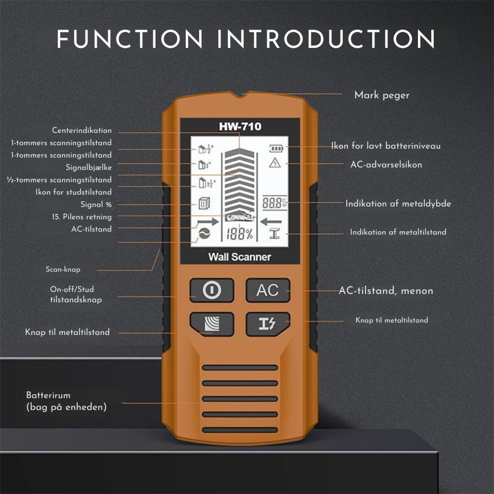 WallScanner™ er kompakt, let og designet til at fungere med kun én hånd. Med enkle trykknapper kan du hurtigt skifte mellem træ-, metal- og kabelfinding, hvilket gør den ideel til både gør-det-selv-projekter og professionelle opgaver.